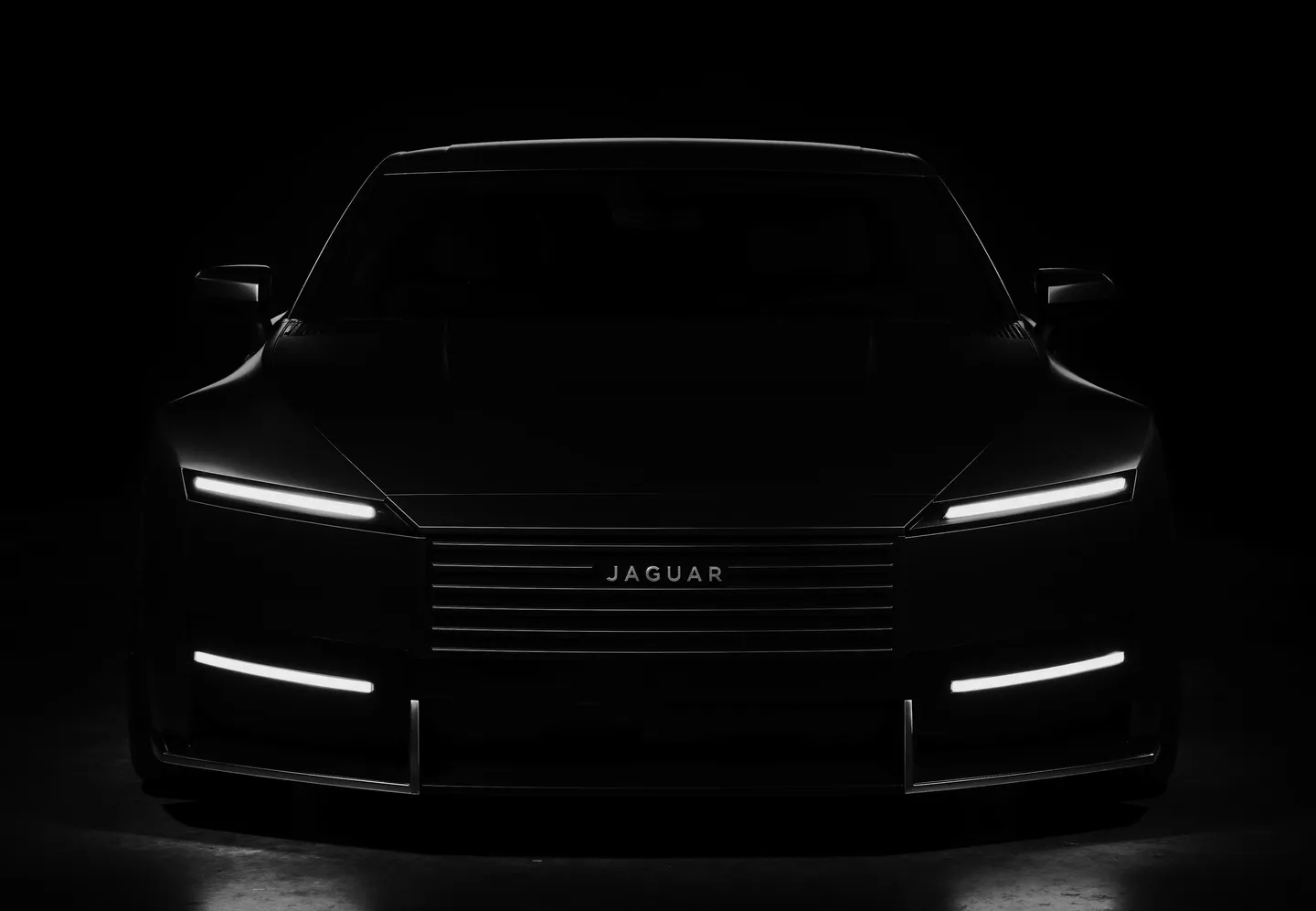 A dramatic studio scene showcases a sleek black Jaguar Type car against a deep black background. The muscular form of the car is sculpted with precise automotive lighting techniques, emphasizing horizontal linear grille, slim LED headlights, and flowing body lines. The glossy black paint reflects the controlled multi-source studio lights, revealing sculptural details while deep shadows enhance the edgy and powerful presence. The front grille prominently displays the 'JAGUAR' logo, surrounded by subtle chrome accents on the lower black fascia that catch light dramatically, creating a sophisticated and intense atmosphere focused on controlled reflections and shadow play.