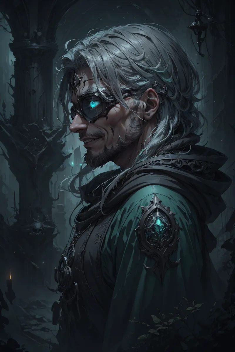 A highly detailed, vibrant portrait of a masculine Icelandic techno-warlock viewed from the side. The character has silver hair, a thin beard, grey-blue glowing eye visible through sci-fi goggles, and wears a dark, tattered mage cloak featuring intricate gothic designs with a green color scheme. This warlock has glowing cursed tattoos and arcane circuitry patterns, with floating skulls and decaying metal elements around him, merging eldritch necromancy with sci-fi technology. The background is a dark gothic forest with eerie ethereal lighting, enhancing the menacing presence and evil smile of the warlock. This artwork conveys a cinematic, soft-lit atmosphere with ultra-detailed textures and a gothic horror style.
