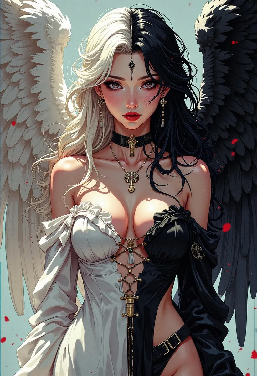 A digital artwork in the style of cknc, split image in two halves, one half shows a stunning oriental female angel, platinum hair, dark eyeshadow, red lips, white gown, the other half shows the woman as fallen angel, black hair, sexy bodysuit with clothing cutouts, cleavage