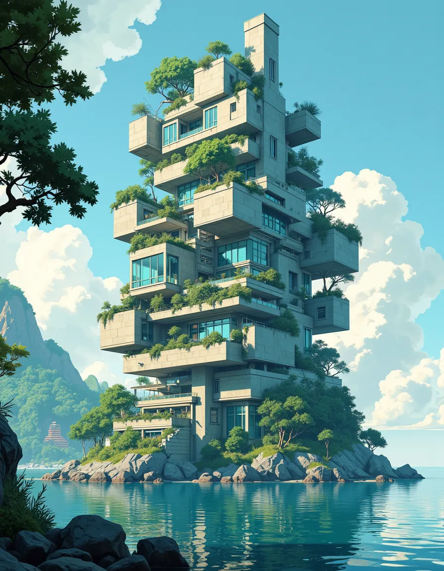 Anime Art, Create a seaside utopian skyline using modular, interlocking buildings that form a layered, cubic ecosystem. Imagine advanced coastal architecture where every level serves a unique functionâgardens, living units, glass-walled cafés. Highlight the contrast between organic life and rigid geometry. The scene is bathed in soft, cool lighting, suggesting early morning. Soft ripples in the water break the reflection of the intricate towers. The mood should evoke calm intelligence and futuristic optimism.. <lora:Anime Art V3_flux:0.6> <lora:Clean_Minimalist_Flux:0.3> <lora:Illustration concept Variant 3A_FLUX:0.4>