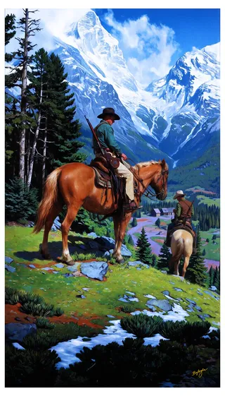 Cinematic Western landscapes with vast skies, glowing sunset clouds, and realistic cowboys on horseback. Smooth, precise oil painting with rich colors, dramatic light, and timeless, heroic mood.