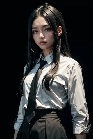 Portrait of a girl with long black hair wearing a white shirt, black tie, and black suit skirt against a simple dark background with front lighting.