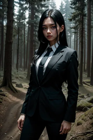 A woman with long black hair dressed in a black suit, white shirt, and black tie, standing on a forest path with tall trees and soft front lighting.
